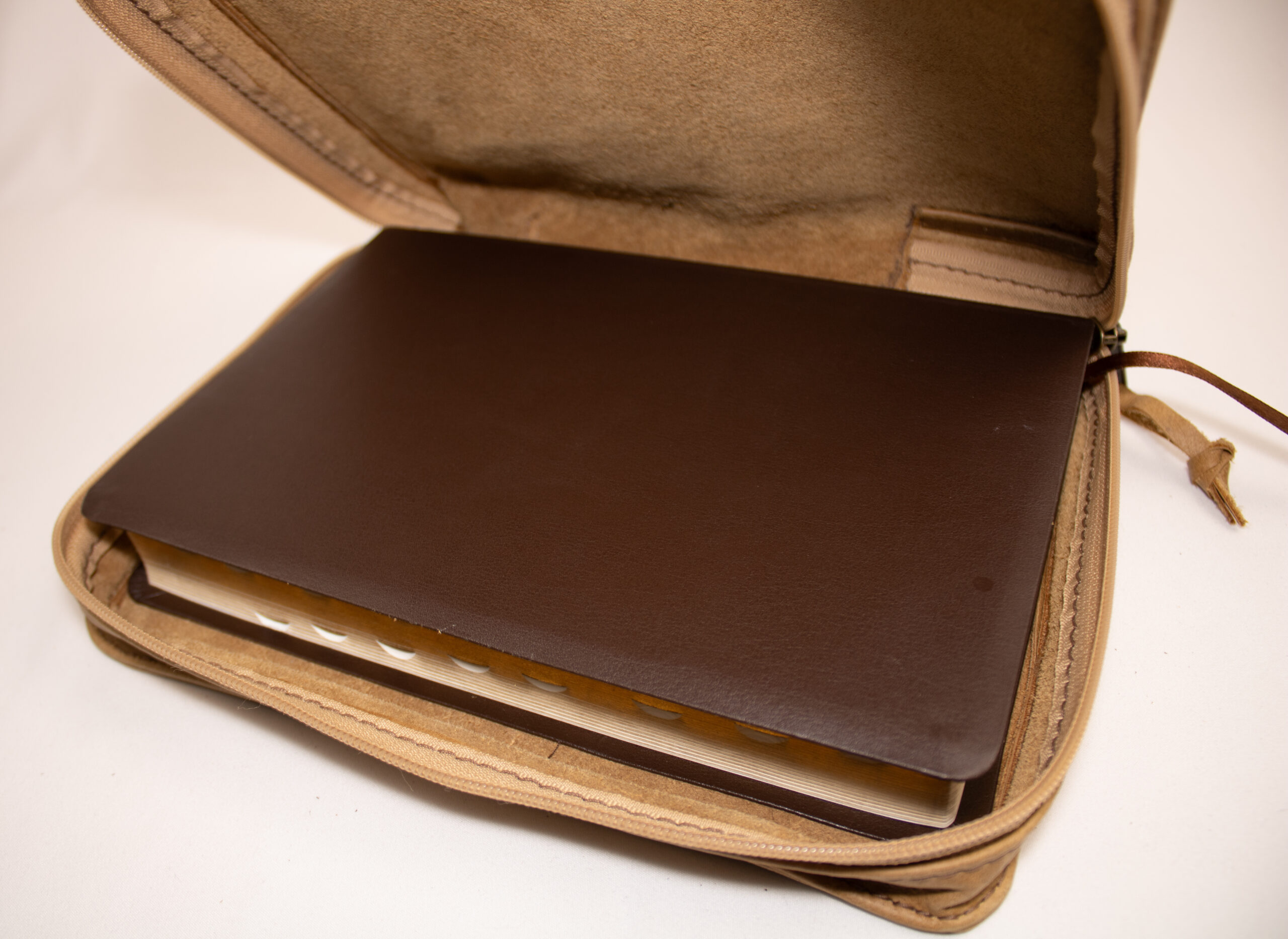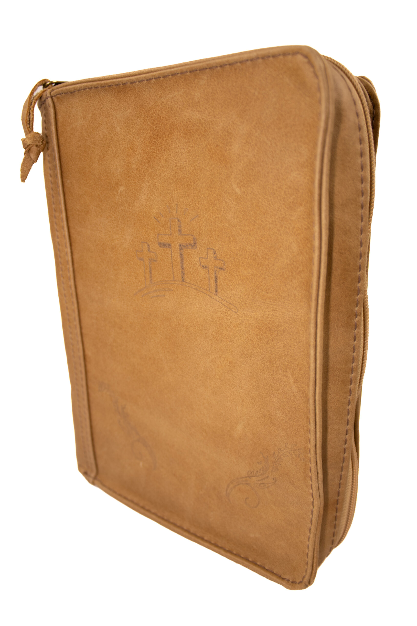 Fits standard Bible with extra space for note book and pens. Comes without any lasering on the cover, custom lasering is available.