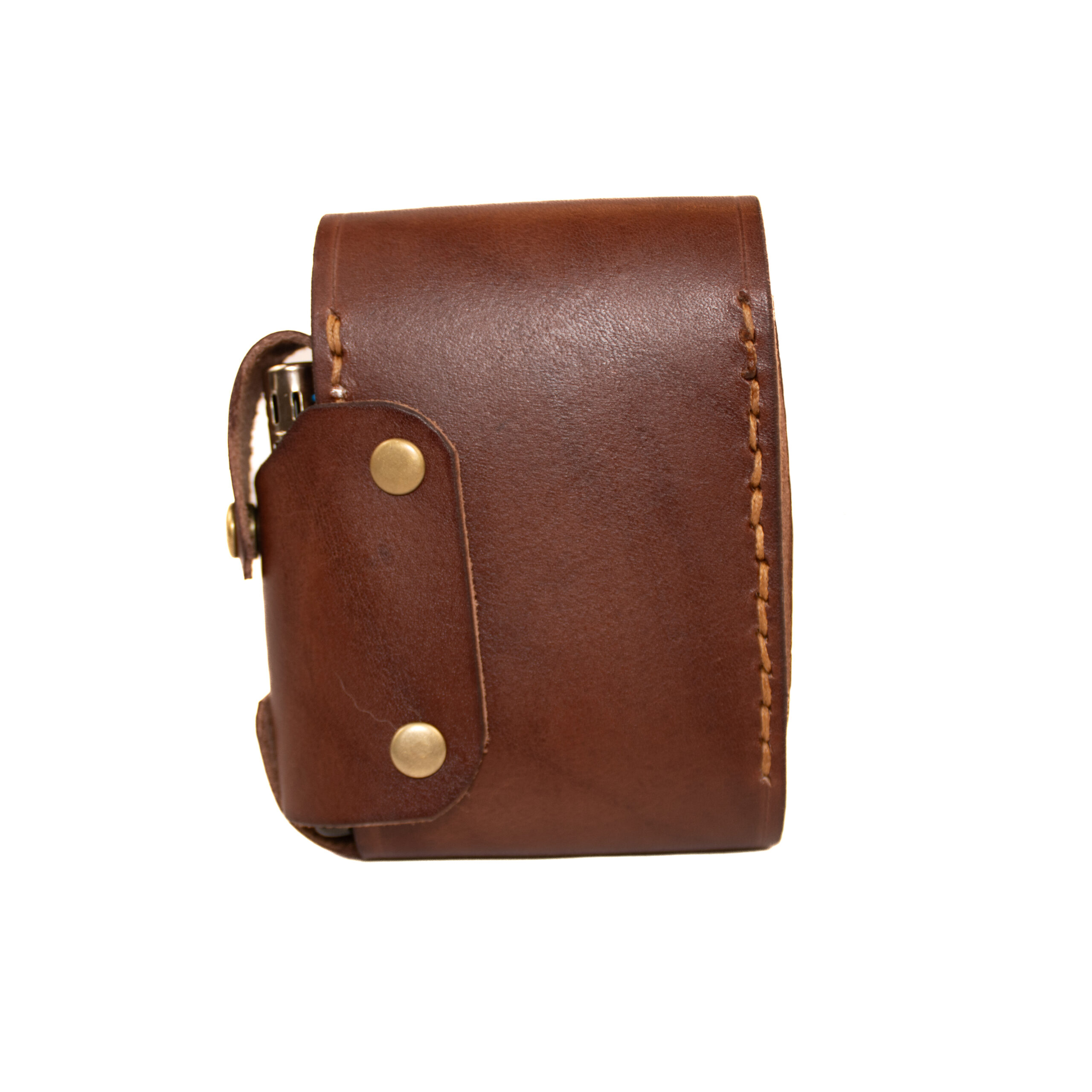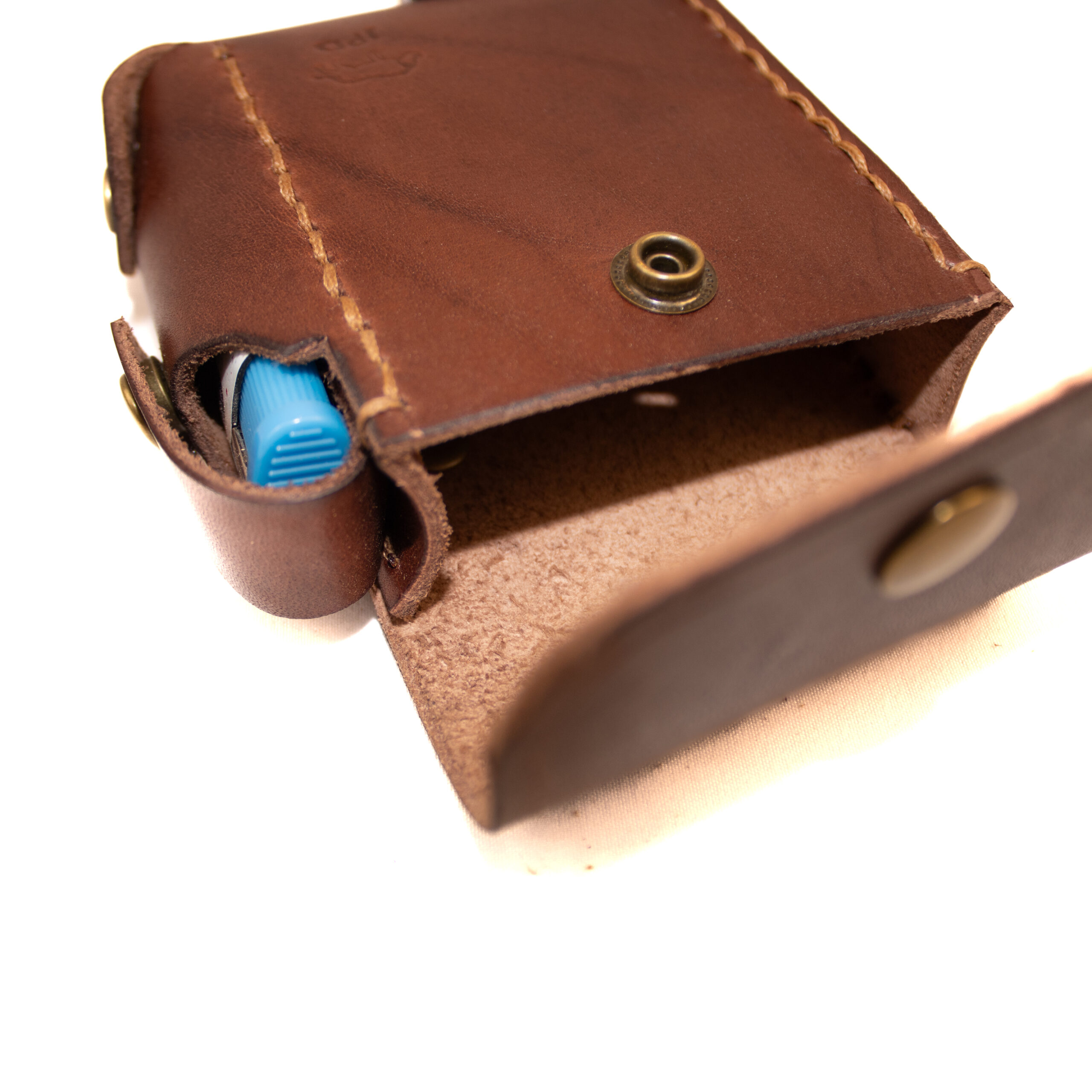 Holds and protects standard cigarette packet and lighter on side